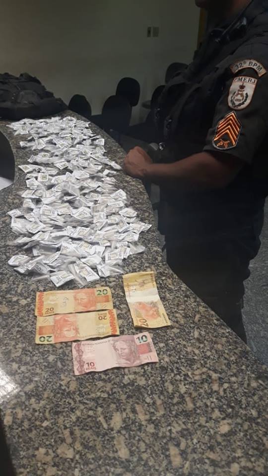 Após incursionarem a localidade, os militares se depararam com Raylon, que tentou fugir e arremessar uma sacola com drogas sobre uma laje. A PM cercou o suspeito e consegui detê-lo. Com ele foram encontrados 210 pinos de cocaína e R$ 70 em espécie. O envolvido foi levado para a 123ª Delegacia Policial de Macaé (123ª DP), onde foi atuado e ficou preso, aguardando transferência para o sistema penitenciário.