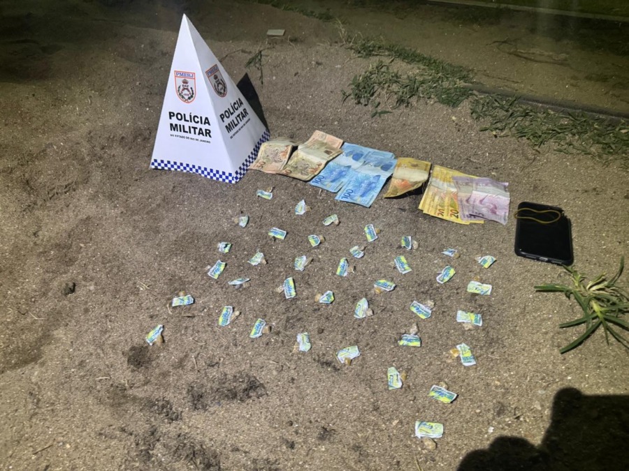 Na abordagem, a PM encontrou duas pedras de crack, R$ 680,00 em espécie e um celular. Os agentes então decidiram realizar uma varredura pelo local e encontraram uma sacola, com 37 pedras de crack.