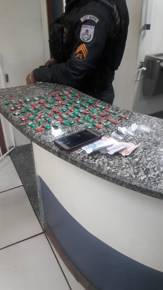 Na ação foram apreendidos 65 tabletes de maconha, três pinos de cocaína, um aparelho celular e R$17,00 em espécie.