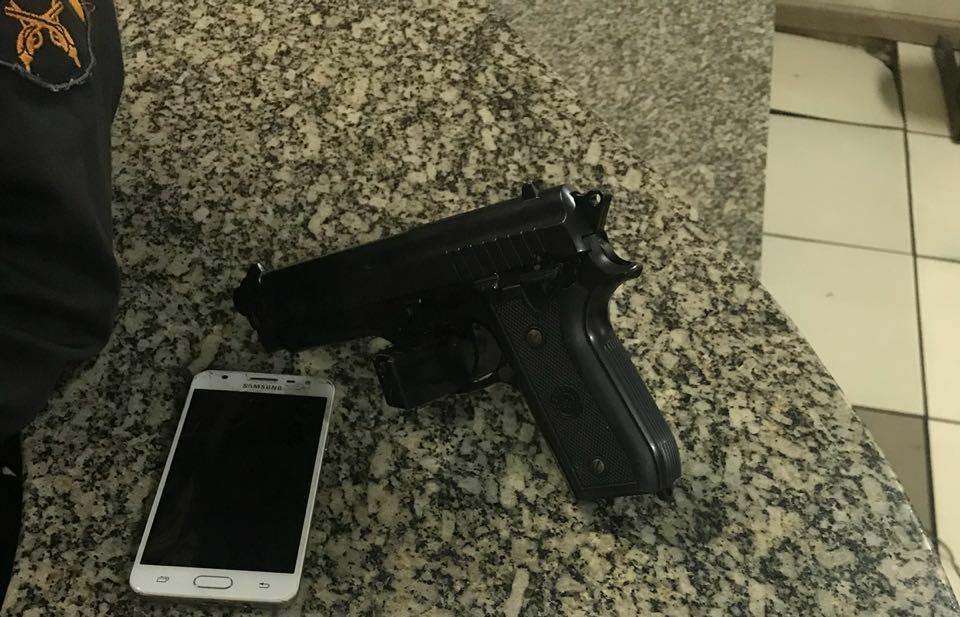 Suspeito foi capturado no quintal da sua casa com a arma falsa e o celular roubado.