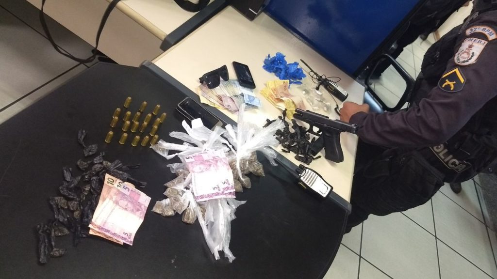 Com a dupla foram apreendidos uma pistola .40, 19 munições 71 sacolés de maconha, 53 sacolés de cocaína, quatro buchas de Skank e R$ 195 em espécie.