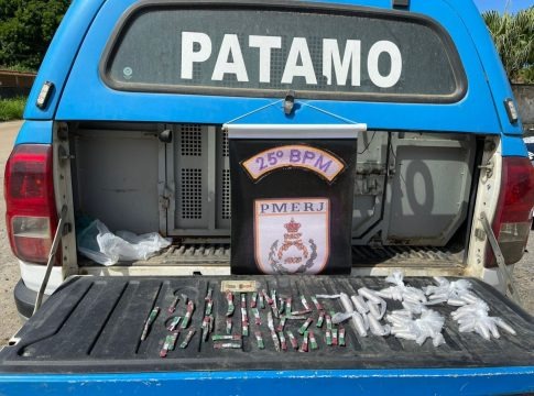 Ao ser abordado, o criminoso disse que estava apenas com um pino de cocaína para uso próprio, escondido no carrinho de bebê do filho. O acusado franqueou a entrada da guarnição na residência, onde foram localizadas outras 41 cápsulas da droga e 45 buchas de maconha nos fundos de um quintal, em meio a entulhos.