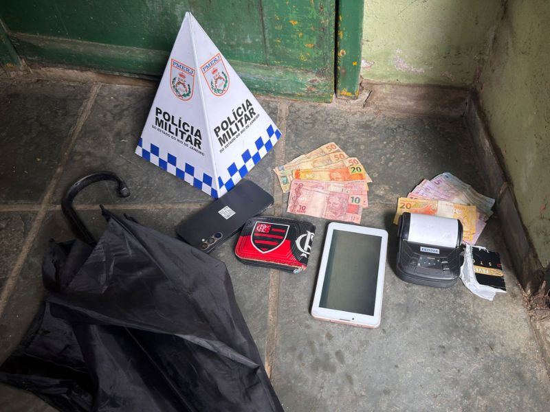 Com o criminoso, foram encontrados 320 reais, 1 telefone celular, uma mini impressora com bobina de papel e um guarda-chuva, onde parte dos números estava escondida, material apontado pela PM como comum na prática do jogo do bicho.
