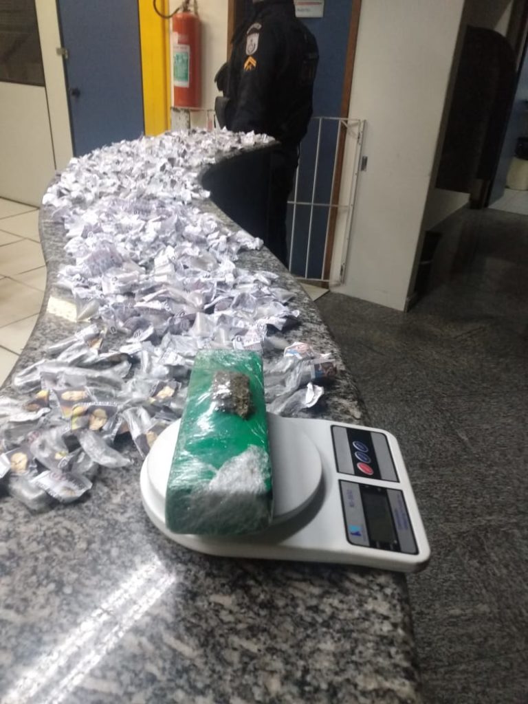 Com ele foram apreendidos um tablete de maconha; 197 pinos de cocaína de R$ 10,00; 228 pinos de cocaína de R$ 20,00; quatro buchas de maconha de R$ 20,00; 31 buchas de maconha de R$ 10,00. O detido e o material apreendido foram conduzidos a 128ª Delegacia Policial de Rio das Ostras (128ª DP) para registro.
