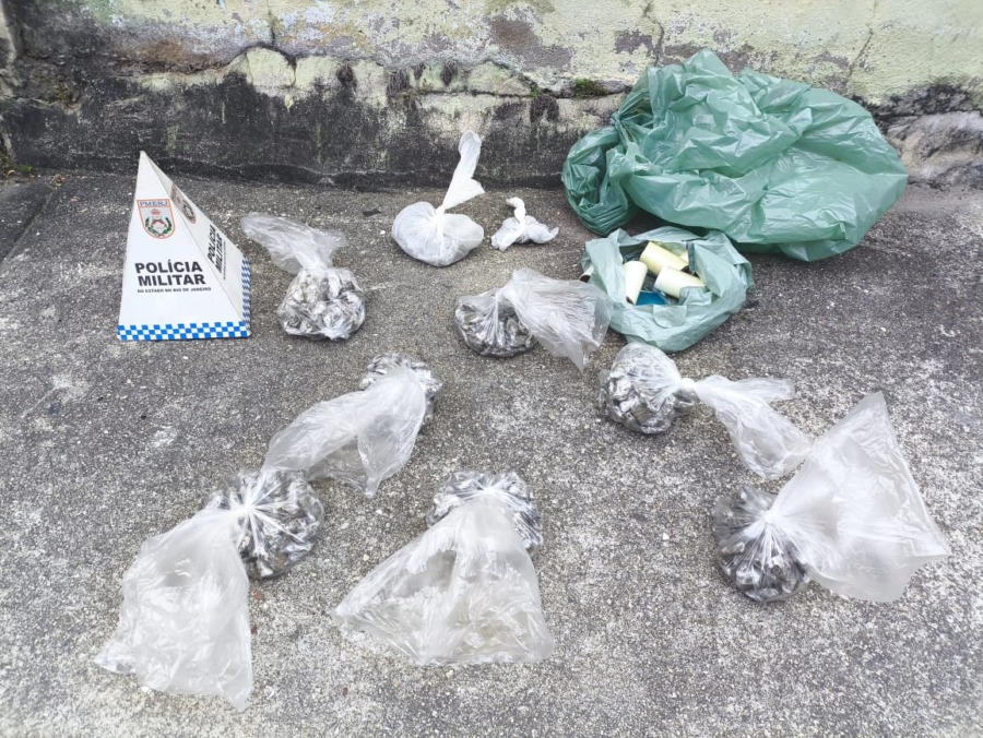 Chegando ao endereço, os policiais encontraram o homem com as mesmas características físicas da denúncia. Próximo a ele estavam seis cápsulas de cocaína, dez buchas de maconha, sete papelotes de PAC, um artefato explosivo, uma sacola com 391 buchas de maconha, material para endolação e uma balança de precisão.
