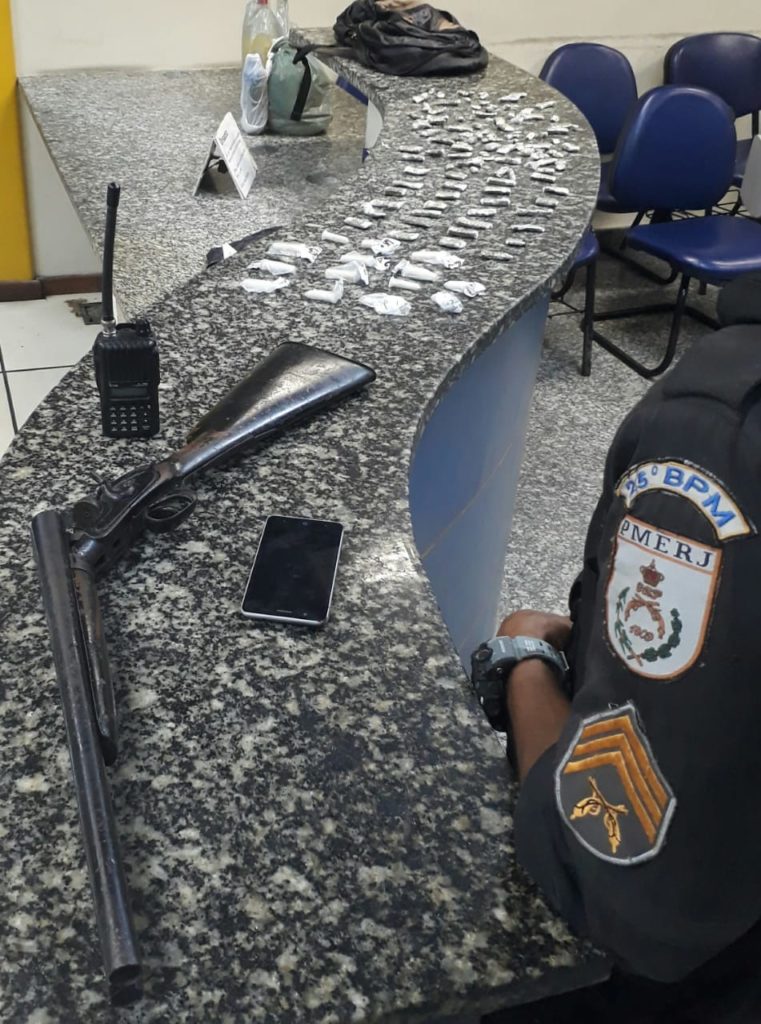 Maluquinho, que já tinha sido preso anteriormente por porte ilegal de arma de fogo foi autuado no artigo 33 e preso na Delegacia de Cabo Frio.
