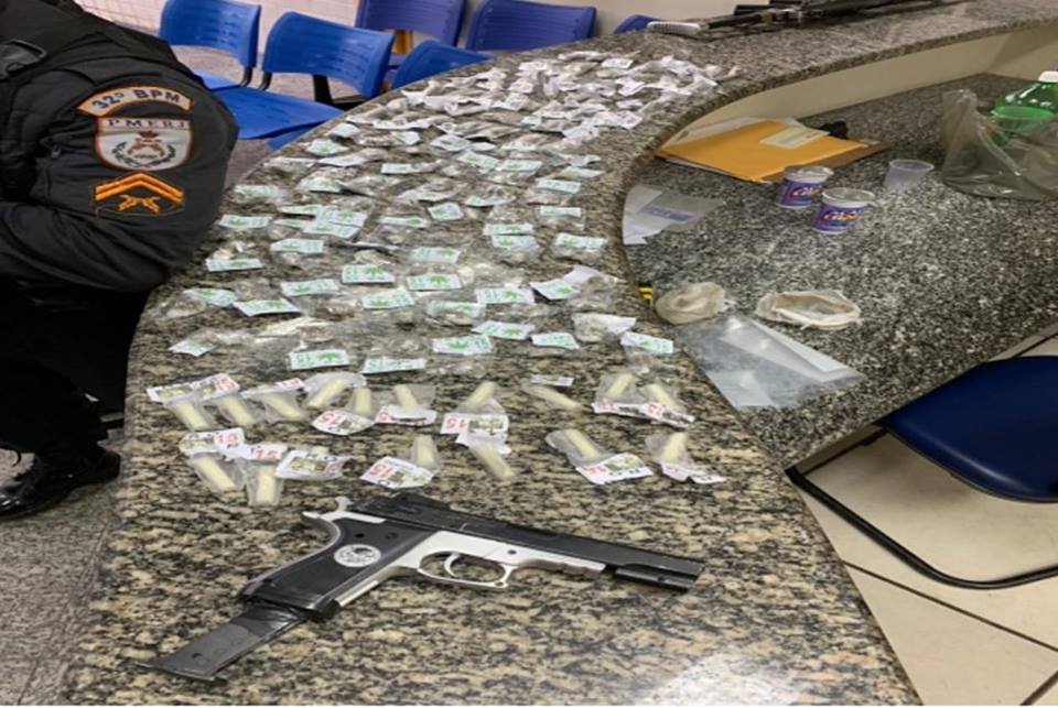 Um jovem de 19 anos foi preso em flagrante por porte ilegal de arma de fogo e tráfico de drogas, na noite deste sábado (6), no bairro Serramar, em Rio das Ostras. A ação foi deflagrada após denúncias anônimas informando que dois homens estariam comercializando entorpecentes em uma travessa.