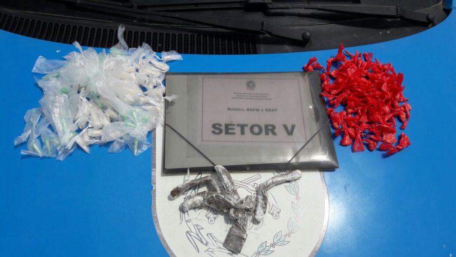 Um jovem de 18 anos foi preso e um adolescente de 15 anos foi apreendido, com 100 pinos de cocaína, 89 pedras de crack, cinco tabletes de maconha e R$50 em espécie na manhã desta quarta-feira (25), em Armação dos Búzios, na Região dos Lagos.