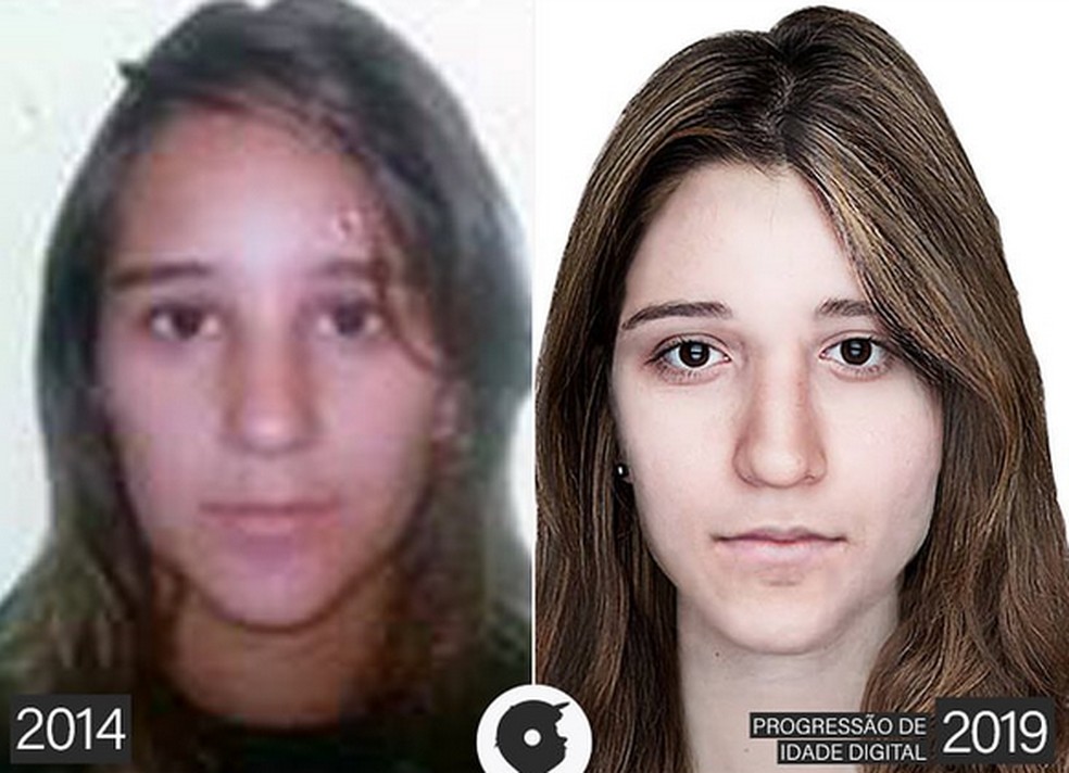 Jennifer Tifany Veiga Pires está desaparecida há cinco anos. O corpo dela nunca foi encontrado. Um cartaz mostra como ela era e como estaria agora.