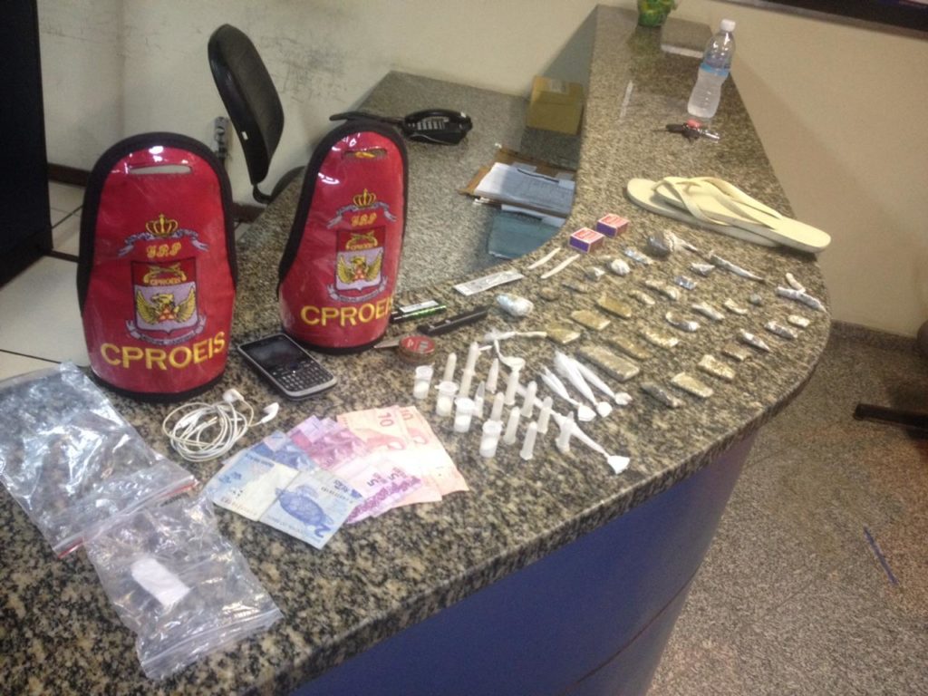 Policiais Militares realizaram a apreensão de 32 tabletes de maconha, dois cigarros prontos da mesma erva, oito baldes e oito buchas de cocaína, um aparelho celular, um triturador, uma faca e R$ 34 em espécie na madrugada desta quinta-feira (13), em Armação dos Búzios, na Região dos Lagos.