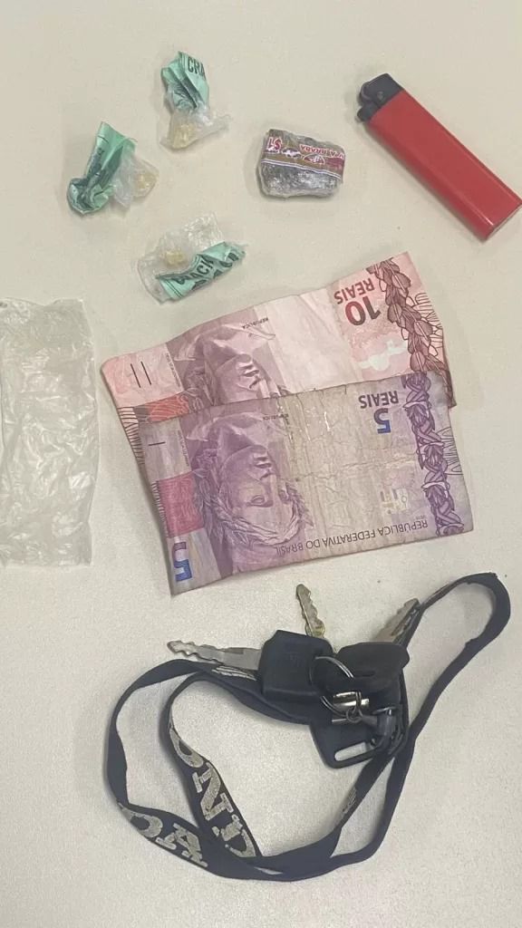 Durante o patrulhamento, os agentes abordaram um homem e uma mulher em uma motocicleta Honda CG 160 Titan, que não utilizavam capacete e não possuíam placa de identificação. Ao realizarem uma revista pessoal no condutor, foram encontradas três pedras de crack, uma bucha de maconha e R$ 15 em espécie.