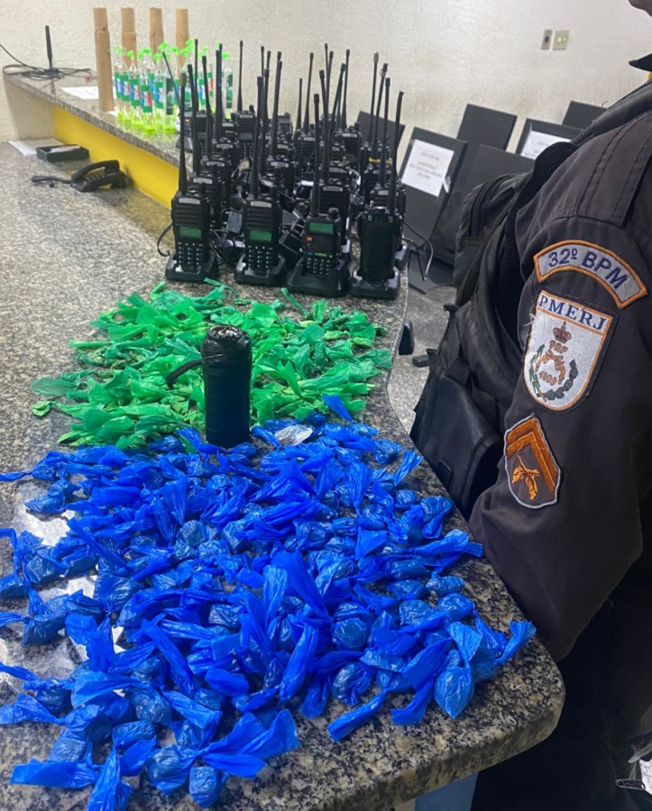 Durante incursão à Rua 14, militares encontraram 139 buchas de maconha, 160 papelotes de cocaína, uma balança de precisão, uma granada de fabricação caseira, 19 vidros com lança-perfume, quatro fogos de artificio, 29 rádios comunicadores e 20 carregadores de rádio.