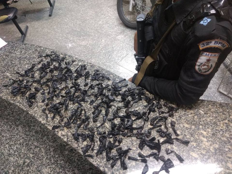 A Polícia Militar (PM) realizou a apreensão de 191 sacolés de cocaína, na noite desta quarta-feira (25), no Morro de Santana, em Macaé. A ação ocorreu durante um patrulhamento de rotina na Rua Leopoldina Neves Pinheiro. Segundo a PM, militares avistaram um homem arremessando uma sacola no chão e desceram da viatura.
