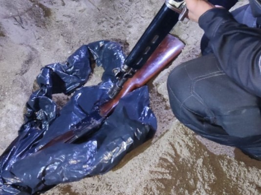 Na Rua Machado de Assis, os policiais encontraram a espingarda enterrada em um terreno abandonado.