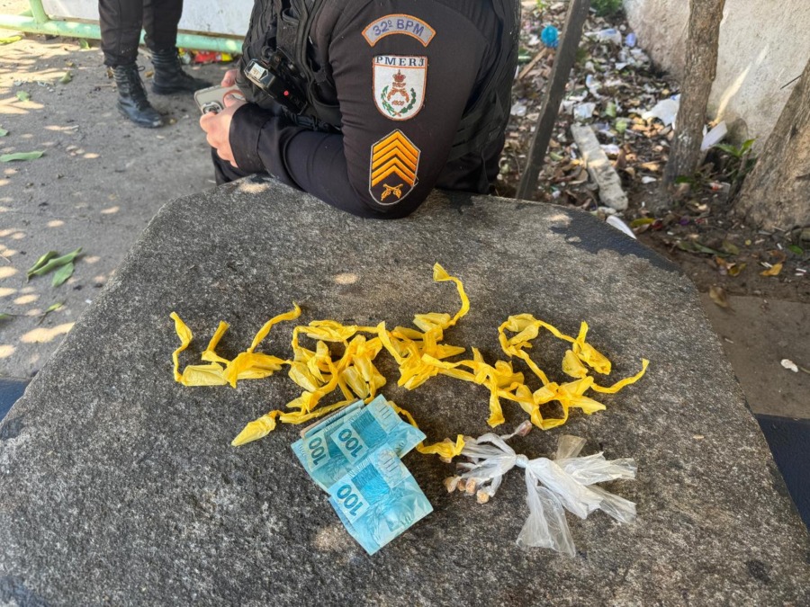 As informações apontavam que um homem com camisa do Botafogo e bermuda branca estava comercializando entorpecentes no local. Os agentes então se aproximaram dele e realizaram a abordagem. Neste momento o suspeito admitiu envolvimento com o tráfico e inclusive indicou o local onde estava escondendo os entorpecentes. O material ainda está sendo contabilizado.