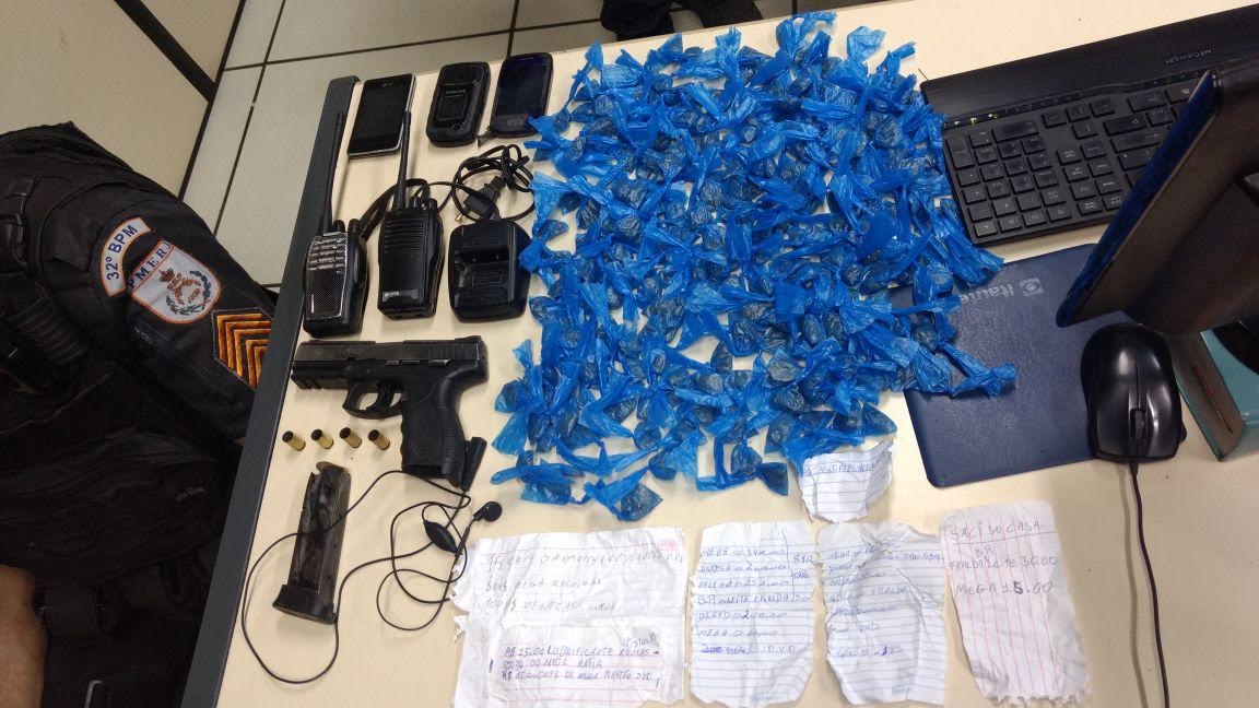 Ele estava com uma pistola ponto 40, com dez munições intactas, 240 trouxinhas de maconha, dois rádios transmissores e várias anotações sobre o comércio de entorpecentes. Segundo a polícia, o suspeito é apontado como “vapor” do tráfico na localidade.