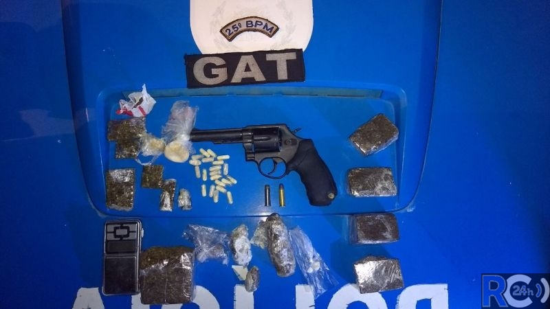 Equipes do Grupamento de Ações Táticas da Polícia Militar (GAT) realizaram a apreensão de um revólver cal.38; duas munições do mesmo calibre; dois tabletes de maconha 700 gr; nove buchas de maconha 130gr; cinco buchas de haxixe 90gr; 21 cápsulas de êxtase; quatro pedras de cocaína;  uma balança de precisão; e material para armazenamento de drogas, na noite de terça-feira (5), em Armação dos Búzios, na Região dos Lagos.