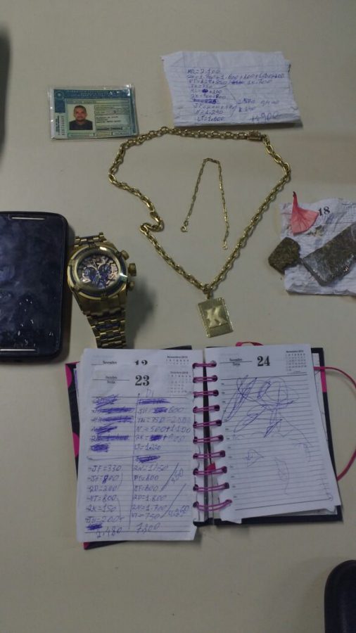 Com ele foi apreendido um pequeno tablete de maconha, um invólucro com cocaína, um cordão, um celular, um relógio e anotações do tráfico de drogas. A polícia disse ainda que o mandado de prisão aberto desde maio deste ano.