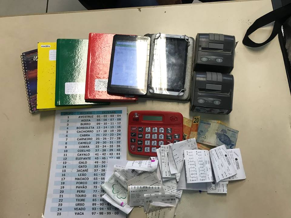 Foram apreendidos quatro cadernos de anotações de jogos de bicho, dois tablets, duas impressoras, R$42,00 em espécie e comprovantes de apostas.