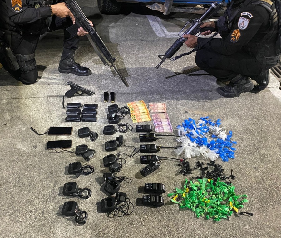 Com eles, foram apreendidos uma pistola calibre 9mm com dois carregadores, 34 munições, 139 papelotes de cocaína, 85 buchas de maconha, dois aparelhos celular, sete rádios transmissores, 19 carregadores de rádio, 11 baterias reserva e R$ 220 em espécie.