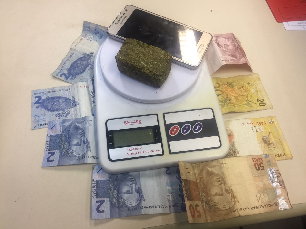Dentro do estabelecimento comercial a PM arrecadou um tablete de maconha, uma balança de precisão, um aparelho celular e a quantia de R$ 108