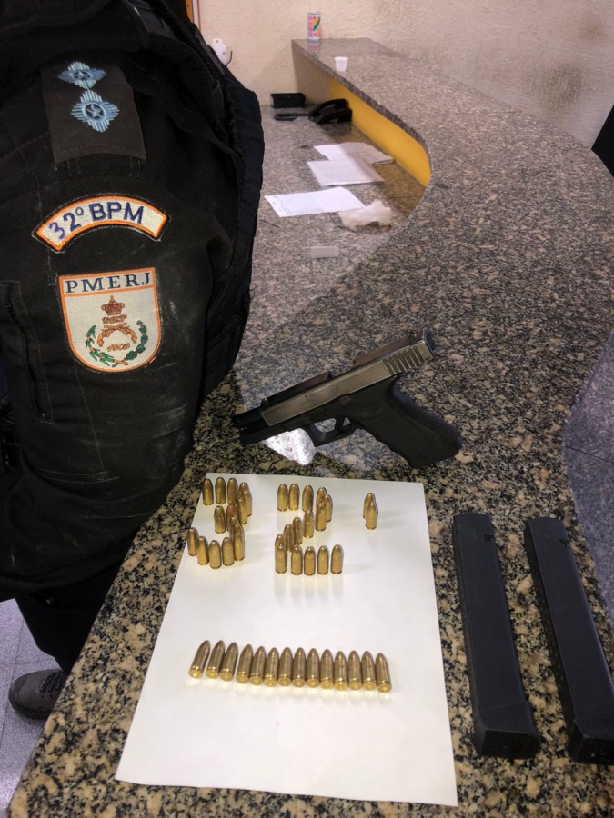 Os agentes receberam informações de que um elemento conhecido como J, apontado como gerente do tráfico local e braço direito de um dos líderes da facção criminosa ADA, responsável por vários ataques à comunidade do Lagomar, estaria com outros criminosos armados próximo ao postinho. No local indicado, o acusado foi capturado com uma pistola calibre 9 mm e diversas munições.