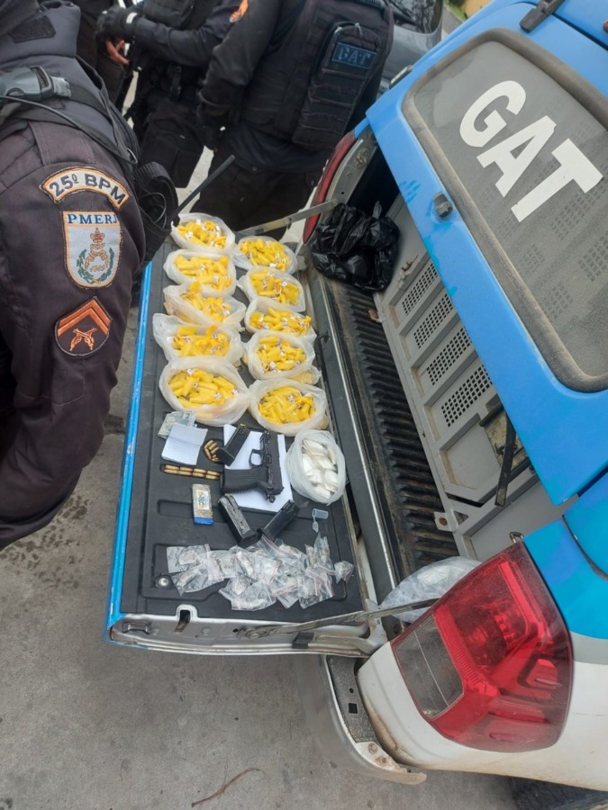 Durante a ação, a PM apreendeu uma pistola calibre 9mm com numeração suprimida, três carregadores, 14 munições, 380 cápsulas de cocaína, 21 trouxinhas de maconha, um caderno de anotações do tráfico, material para endolação e R$ 8 em espécie. O acusado foi encaminhado para a 126ª Delegacia de Polícia (126ª DP), autuado e preso por porte ilegal de arma de fogo e tráfico de drogas.