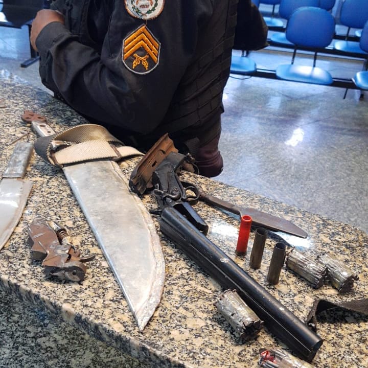 Ao incursionarem a localidade, militares detiveram o suspeito com uma espingarda calibre 28, três cartuchos calibre 28 deflagrados, duas facas, um facão e quatro pacotes de pregos enrolados com fitas. Segundo moradores, o preso tentava os agredir com as armas.