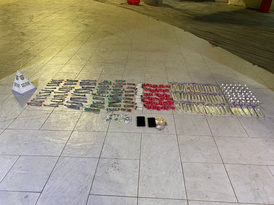 A ação aconteceu durante o patrulhamento na Avenida Costa Azul, na orla, quando agentes flagraram 2 adolescentes em situação de comércio de drogas, encontram com um deles diversas drogas, como loló, lança-perfume, cocaína, maconha e haxixe.