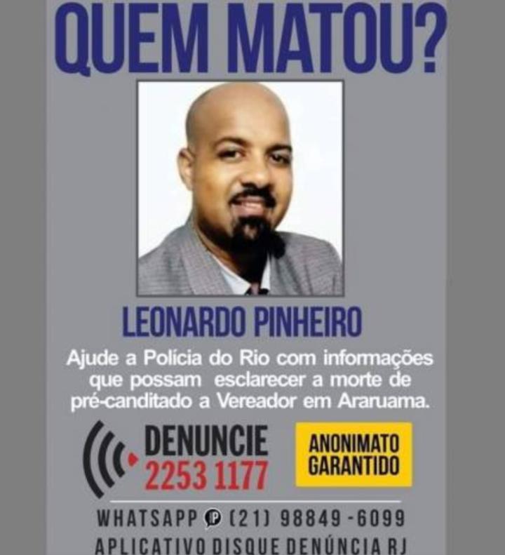 O Portal dos Procurados divulgou um cartaz, nesta quinta-feira (14), para ajudar a 118ª Delegacia de Polícia de Araruama com informações que possam levar à identificação e localização dos envolvidos na morte do jornalista e pré-candidato a vereador de Araruama, Leonardo Pinheiro, de 39 anos.