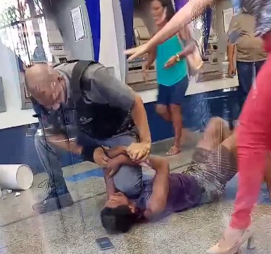No vídeo é possível ver que pessoas que estavam no banco começam a gritar pedindo para que o segurança pare com a ação. Uma mulher, aparentemente funcionária da agência, se aproxima e começa a interceder pelo rapaz, que é liberado pelo profissional após algum tempo.