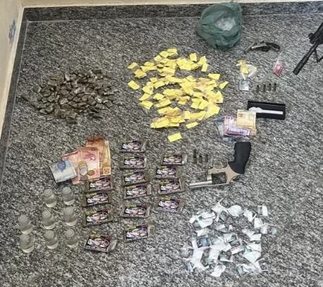 Após buscas no local, a polícia encontrou diversas drogas, entre elas cocaína, maconha, crack e loló, além de um revólver calibre 38 e uma garrucha calibre 22. Dentro da residência, a esposa do suspeito, I.B.S.D.N., de 24 anos, também foi encontrada e autorizou a entrada dos agentes. No imóvel, foram apreendidos mais drogas, munições e uma quantia em dinheiro.