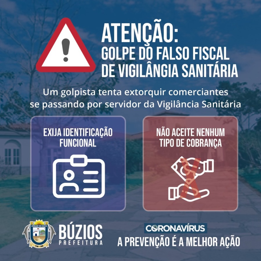 A Prefeitura de Armação dos Búzios, através da Vigilância Sanitária da Secretaria de Saúde, emitiu um alerta aos comerciantes sobre denúncias de um suposto contato, por telefone ou aplicativo, onde criminosos se fazem passar por agentes públicos para extorquir dinheiro.