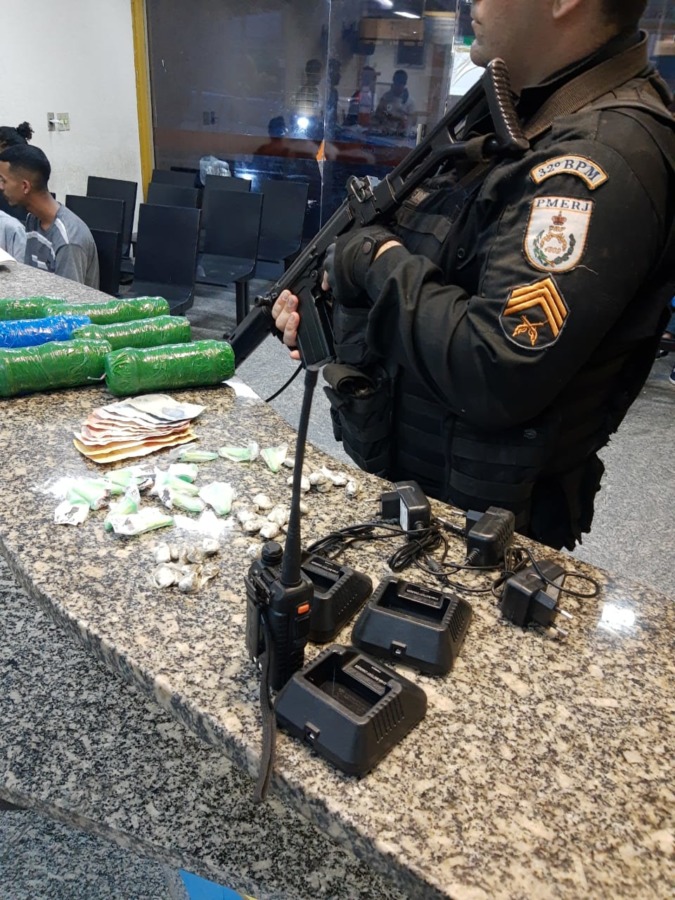 Com eles, foram apreendidas 32 buchas de maconha, 14 pinos de cocaína, um rádio comunicador baofeng, três carregadores de rádio, uma quantia em dinheiro não contabilizada e seis granadas caseiras. Todos foram conduzidos a 123ª Delegacia Policial de Macaé (123ª DP).