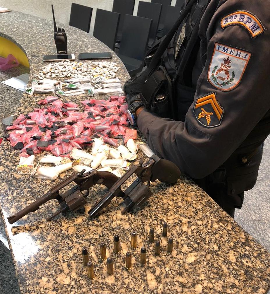 à Rua W24, militares avistaram e abordaram os suspeitos. Com eles, foram apreendidos um revólver calibre 38, um revólver calibre 32, oito munições, 84 pinos de cocaína, 221 buchas de maconha, 11 filetes de maconha de da mesma erva e um rádio transmissor.