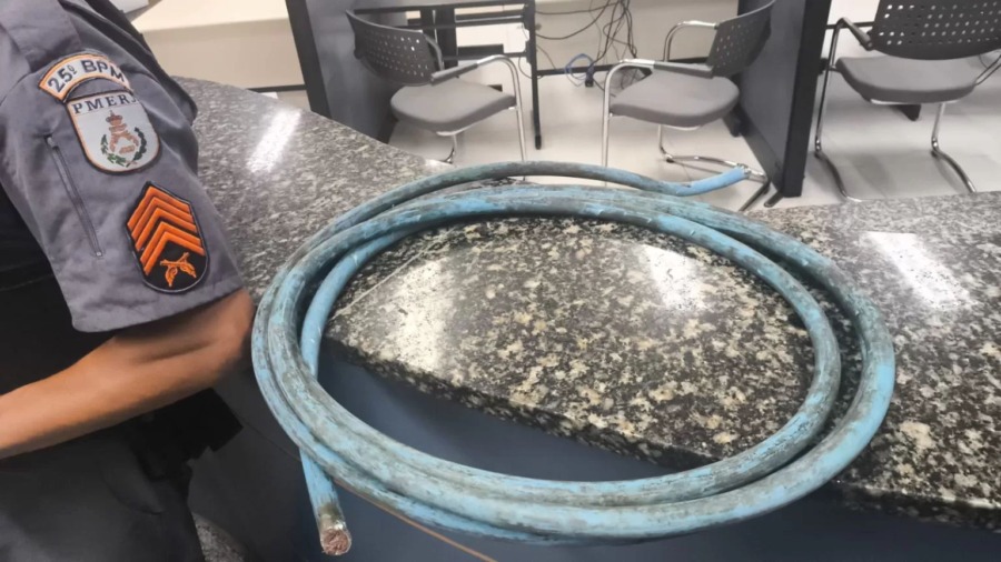 Durante a madrugada desta quinta-feira (20), aproximadamente cinco metros de cabo de fio grosso foram apreendidos pela Polícia Militar na Rua da Luz, no bairro Braga, em Cabo Frio. A equipe foi chamada para investigar um possível furto de fios no topo de um poste, mas ao chegar ao local, não encontrou nenhuma atividade suspeita.