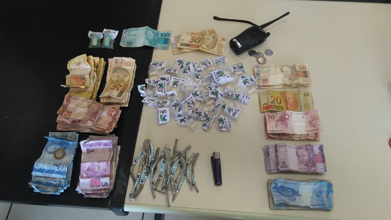 Na ação foram arrecadados 51 pinos de cocaína, 18 buchas de maconha, um radiocomunicador e R$ 1.356 em espécie