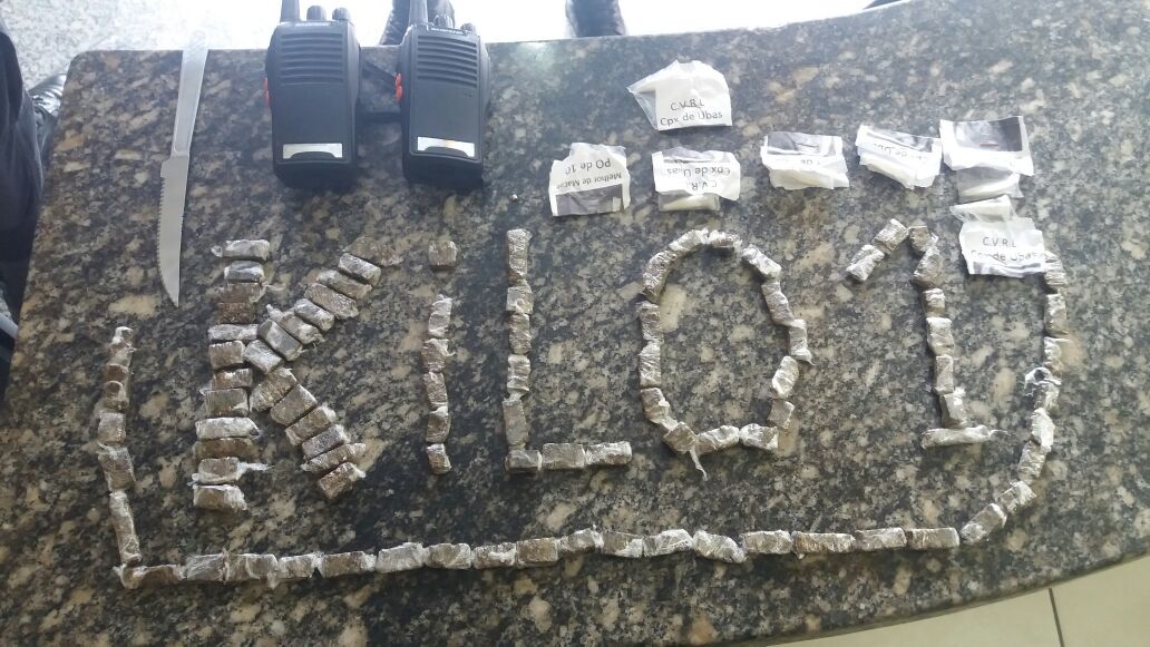 Na ação foram arrecadados, uma pistola 9 mm com 5 munições intactas, 4 rádios de comunicação com carregadores, 504 buchas de maconha e 18 frasco de lança perfume