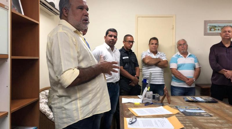 À esquerda, Prefeito de Casimiro, Paulo Dames (PSB), recebe autoridades de segurança pública do município e do Estado para lançamento de centrais de monitoramento em Casimiro e em Barra de São João