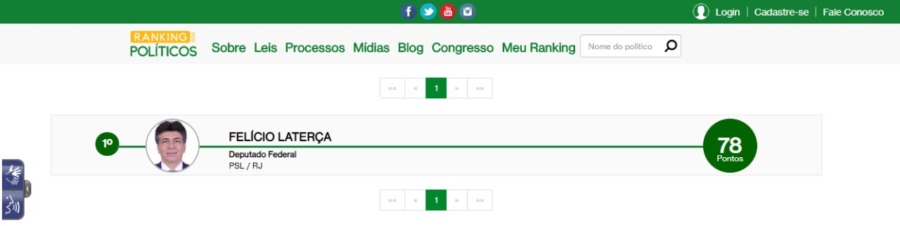 Deputado Federal Felício Laterça alcança o primeiro lugar no Ranking dos Políticos