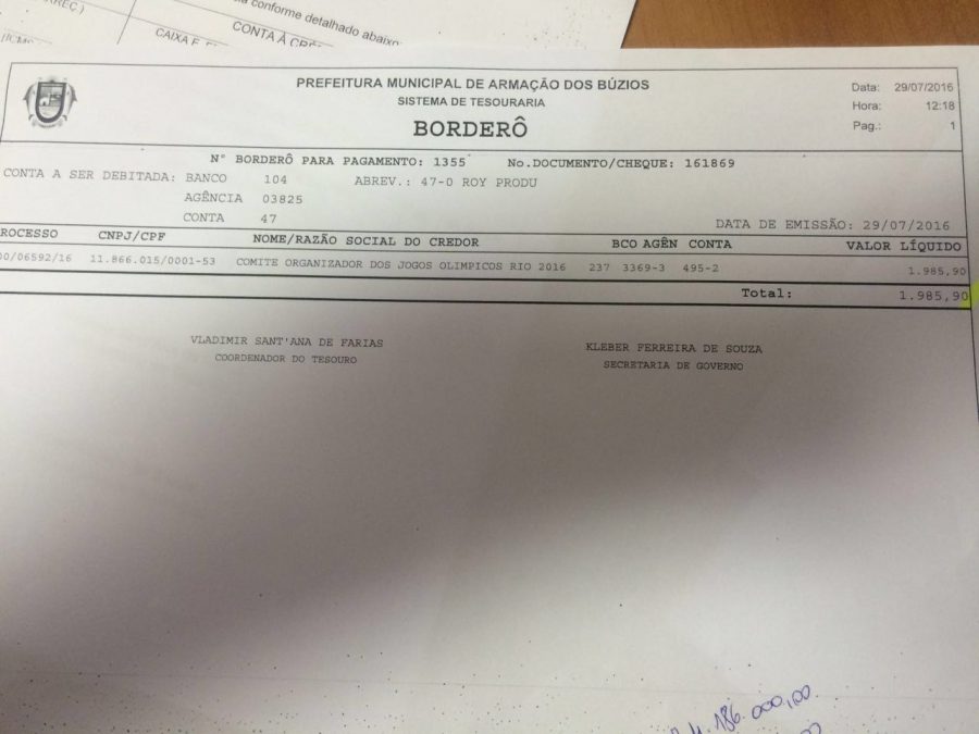 Foi notícia em todo país a passagem da tocha olímpica pela cidade de Búzios, onde os principais personagens a carregarem o símbolo olímpico foram a centenária Dona Eva e o velejador Bimba. No entanto, diante das notícias dos gastos exorbitantes de cidades Brasil a fora, se levantou o questionamento entre os buzianos de quanto teria custado esse momento de festa para o município. Vereadores de oposição chegaram a discursar na sessão desta terça-feira, dia 2, sobre necessidade de economia diante do momento de recessão econômica. No entanto, toda a especulação caiu por terra na mesma sessão após o vereador Lorram Silveira (PP) expor o processo que mostra que o gasto foi de apenas R$ 1.985,90.