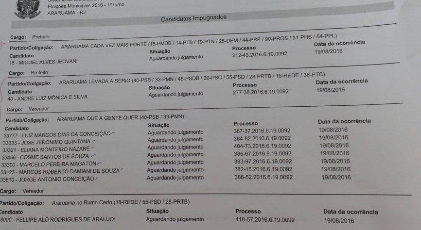 O pedido de impugnação dos candidatos André Mônica e Miguel Jeovani, caso seja aceito pela Juíza Alessandra de Souza Araújo, pode ditar os rumos do pleito eleitoral de 2016 pela cadeira de prefeito na cidade de Araruama.