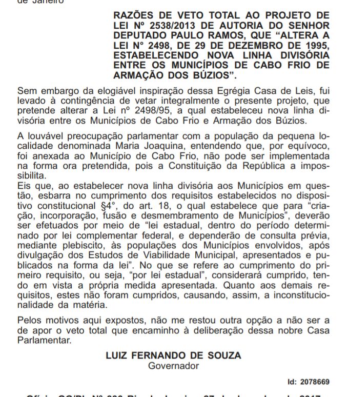 O Governador do Estado do Rio de Janeiro, Luiz Fernando – Pezão, decidiu vetar o projeto de lei 2538/2013, que faria com que o bairro Maria Joaquina passasse a pertencer ao município de Búzios. Atualmente, o bairro faz parte de Cabo Frio, porém há uma luta antiga dos moradores para mudar esse cenário, tendo em vista a maior compatibilidade com Búzios.