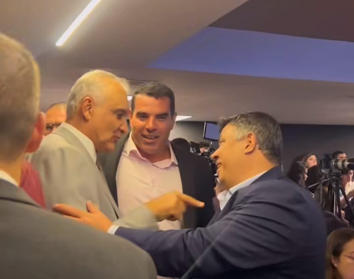 Durante a solenidade, Carlos Augusto conversou com autoridades municipais e estaduais, como o prefeito de Iguaba Grande, Fabinho (CIDADANIA), e o deputado estadual de Macaé, Chico Machado (SOLIDARIEDADE), além do próprio governador do Rio.