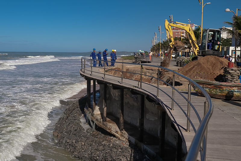 O secretário explicou que no local onde ocorre o trabalho, o gabião se deslocou para outro ponto da orla, além de acrescentar que, além desse trecho, parte do calçadão no Posto 2 também foi atingida e receberá reparos.