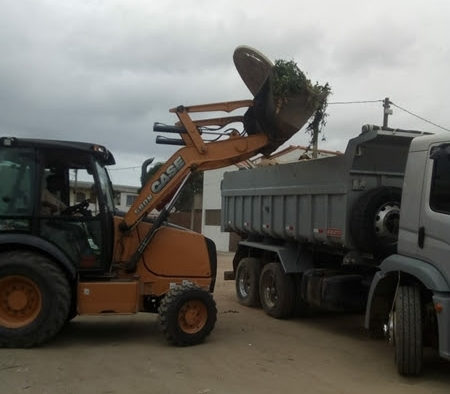 Caminhões e máquinas patrol foram usadas pela prefeitura para ajudar na limpeza pública, recolhimento de entulhos e manutenção de vias