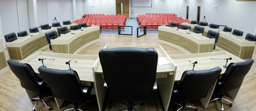 Imagem da plenária, onde os vereadores promovem seus debates, e da assistência, local onde fica a plateia, no interior da sala de sessões da Câmara Municipal de Macaé completamente vazia