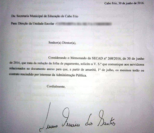 Fica a dúvida sobre mais um caso que envolve a prefeitura de Cabo Frio. Mais uma mostra da má administração que vive a cidade. Teriam sido os funcionários apenas suspensos, como diz o prefeito? Alguns funcionários reafirmam o que disse a secretária, que receberam memorandos para rescindir os contratos. Fato é que essas pessoas estão destituídas de suas funções, e no momento em que a cidade se encontra, ficar sem salário é mais um problema para enfrentar.