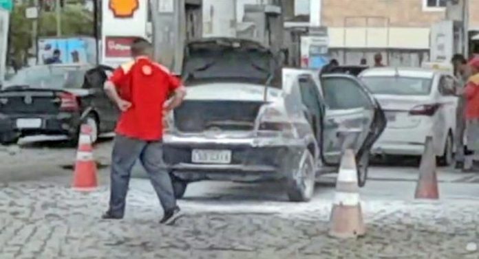 A cena chamou atenção dos frentistas e dos clientes que estavam dentro do posto de combustível e o proprietário do veículo saiu correndo para se proteger do incêndio.