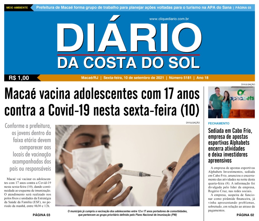 Edições Impressas Edição de sexta-feira 10/09/2021 n° 5181 Publicado em 10/09/2021 - 00:13 Escrito por Fernando Vitor Notícias relacionadas: Seguinte Edição de Sábado a segunda-feira 11 a 13/09/2021 n° 5182 Anterior Edição de quinta-feira 09/09/2021 n° 5180 Fernando Vitor Notícias Recentes Cabo Frio8 horas atrás Reforma marca nova fase para o esporte cabo-friense e aniversário da cidade Arraial do cabo8 horas atrás Fórum de Arraial propõe novo modelo de desenvolvimento baseado nos 3Ds; Desvincular, Descarbonizar e Descontaminar Saúde8 horas atrás Saúde de Rio das Ostras promove mutirão de cirurgia pediátrica nessa semana Cidades8 horas atrás Guarda Ambiental resgata jiboia de três metros em área urbana de Macaé Cidades8 horas atrás Vereadores de Macaé vão embarcar nesta quinta para participar da COP 30 em Belém Arraial do cabo9 horas atrás Parceria com a PF fortalece preparo técnico da Segurança Pública de Arraial do Cabo Arraial do cabo9 horas atrás Iniciativa busca compensar emissões de carbono da frota de Arraial Cidades9 horas atrás Parceria com o Estado reforça prevenção de enchentes em Rio das Ostras há 39 dias do verão Desenvolvimento10 horas atrás Arteris vence novo leilão da BR-101 e mantém operação da via até 2047 Cidades10 horas atrás Prefeitura de Quissamã abre prazo para solicitação de isenção do IPTU 2026 e 2027 Clique Diário E. L. Mídia Editora Ltda CNPJ: 09.298.880/0001-07 Redação: Rua Tupinambás 122 Gloria – Macaé/RJ comercial@diariocs.com (22) 2765-7353 (22) 999253130 Mais lidas da semana Arraial do cabo7 dias atrás Arraial do Cabo celebra 3ª edição do Festival de Frutos do Mar com entrada livre; Carol Biazin, Ramona Rox, Liah Soares e mais Meio Ambiente6 dias atrás Ações do Programa Limpa Rio seguem em vários pontos de Rio das Ostras Cabo Frio6 dias atrás Música, poesia e memória celebram os 410 anos de Cabo Frio Polícia15 horas atrás Farmácia é interditada e uma pessoa é presa em Rio das Ostras em operação da Polícia Federal
